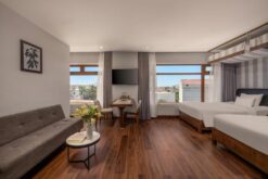 The Deluxe King Room offers a compact yet comfortable space, perfect for short stays. Designed with your convenience in mind, it features a private area with soft natural light, a well-organized work desk, and a standing shower, providing everything you need for a relaxing and productive stay. Step out onto the balcony to enjoy beautiful ocean views, making it an ideal choice for both leisure and work.
